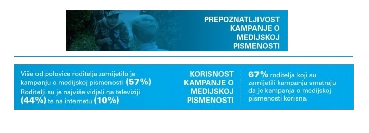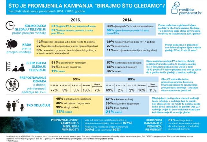 Istraživanje o navikama gledanja televizije kod djece u Hrvatskoj, koje je u studenome ove godine ponovila agencija Ipsos Puls nakon provedbe kampanje o medijskoj pismenosti, ukazuje na promjene u tome kako djeca i roditelji gledaju televiziju. Većina djece televizijski program prati u društvu obitelji, a svega 11% njih pred ekranom je samo. Prije samo dvije godine svako treće dijete program je pratilo bez nadzora odrasle osobe. Gotovo svi roditelji, odnosno njih 93%, prepoznaju oznake za dobnu primjerenost sadržaja na televiziji i znaju čemu one služe. Prilikom odlučivanja o tome što dijete smije gledati, roditeljima je najvažnija primjerenost sadržaja, a 67% roditelja kampanju o medijskoj pismenosti smatra korisnom.