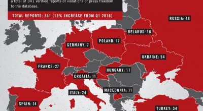 Između 1. travnja i 30 lipnja 2016. mreži Mapping Media Freedom 18 dopisnika i drugih novinara podnijelo je 341 provjereni izvještaj o nasilju nad novinarima i ugrožavanju slobode medija, 13% više nego u prvom kvartalu 2016.